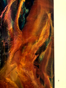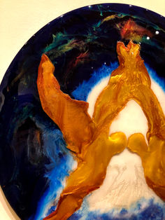 This painting is a Star of David made with resin, fire glass, alcohol inks, acrylic paint, and mica powders.